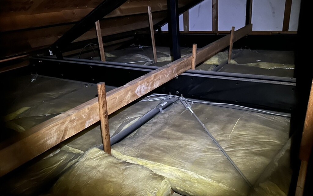 施工前の天井裏の様子、断熱材は敷いてありますが50ミリ程度で隙間が多い